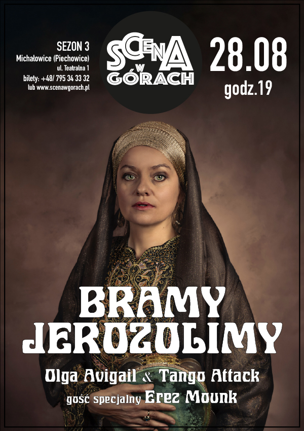 Do Jerozolimy prowadzi osiem bram… Każda z nich to opowieść o Bogu, ludziach, miłości i nienawiści…Olga i jej przyjaciele poprowadzą nas przez bramy do Świętego Miasta, by zanurzyć się w jego muzycznym, rozpalonym tyglu. Na koncercie usłyszymy pieśni wypełnione tęsknotą za blaskiem Syjonu, które zabrzmią po hebrajsku, w ladino i w jidisz. Zatrzymamy się w złotych bramach Jerozolimy, by wsłuchać się w głosy tych, którzy od wieków przekraczali ich progi – w rytmie orientalnych rytmów arabskich czy też inspirowanych mistyczną monotonią nigunów chasydzkich. Bramy wypełnią też biblijne wersety i intencje wkładane w małe kwitełe. Wokalistka przekracza granicę światów kulturowych, śpiewając w Jidisz do tradycyjnych melodii otomańskich, łącząc głosy Żydów z Jemenu i polskiej Rebeki z Kazimierza.