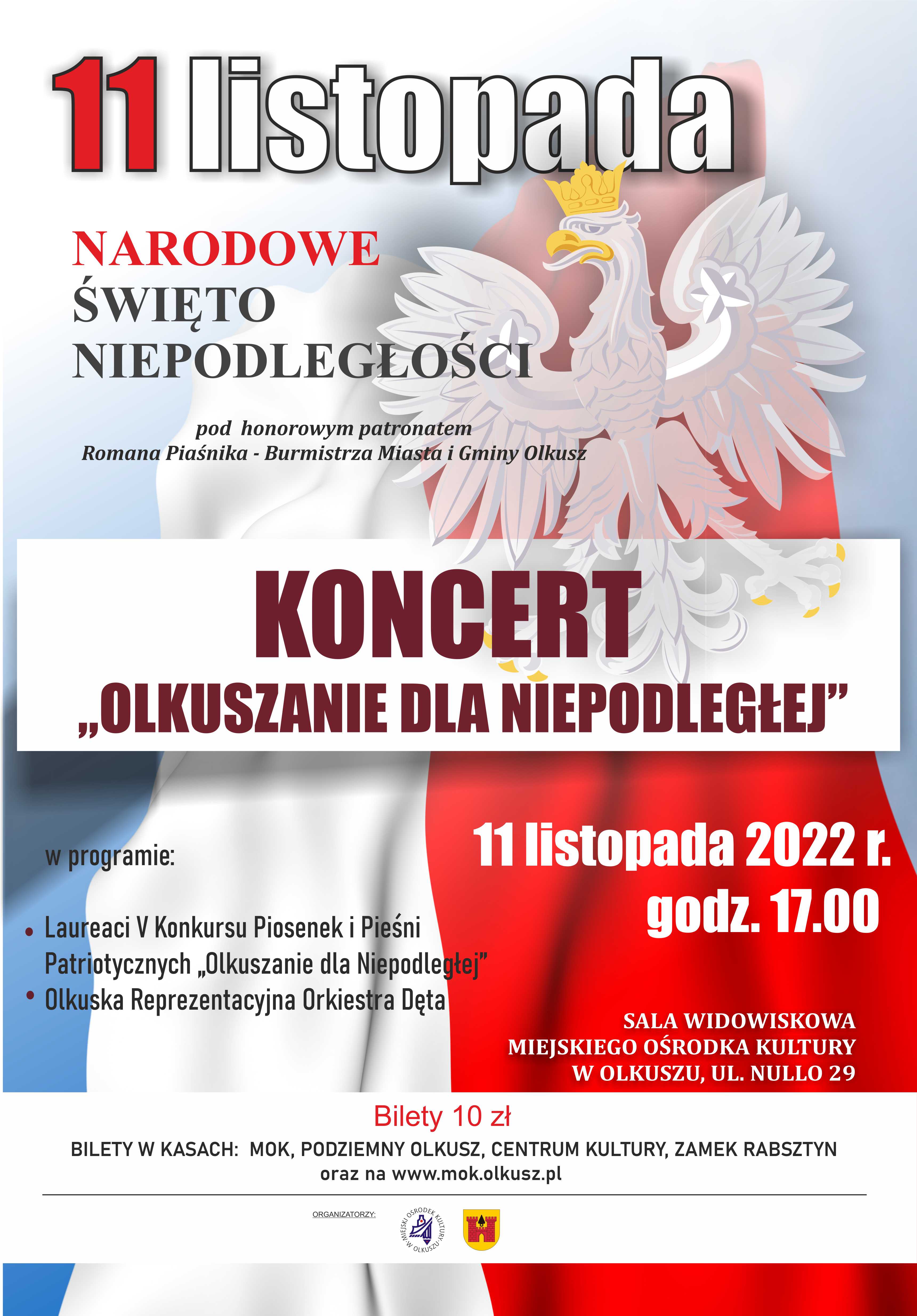 Zapraszamy na doroczny koncert z okazji Narodowego Święta Niepodległości "Olkuszanie dla Niepodległej"pod honorowym patronatem Romana Piaśnika - Burmistrza Miasta i Gminy Olkusz.
