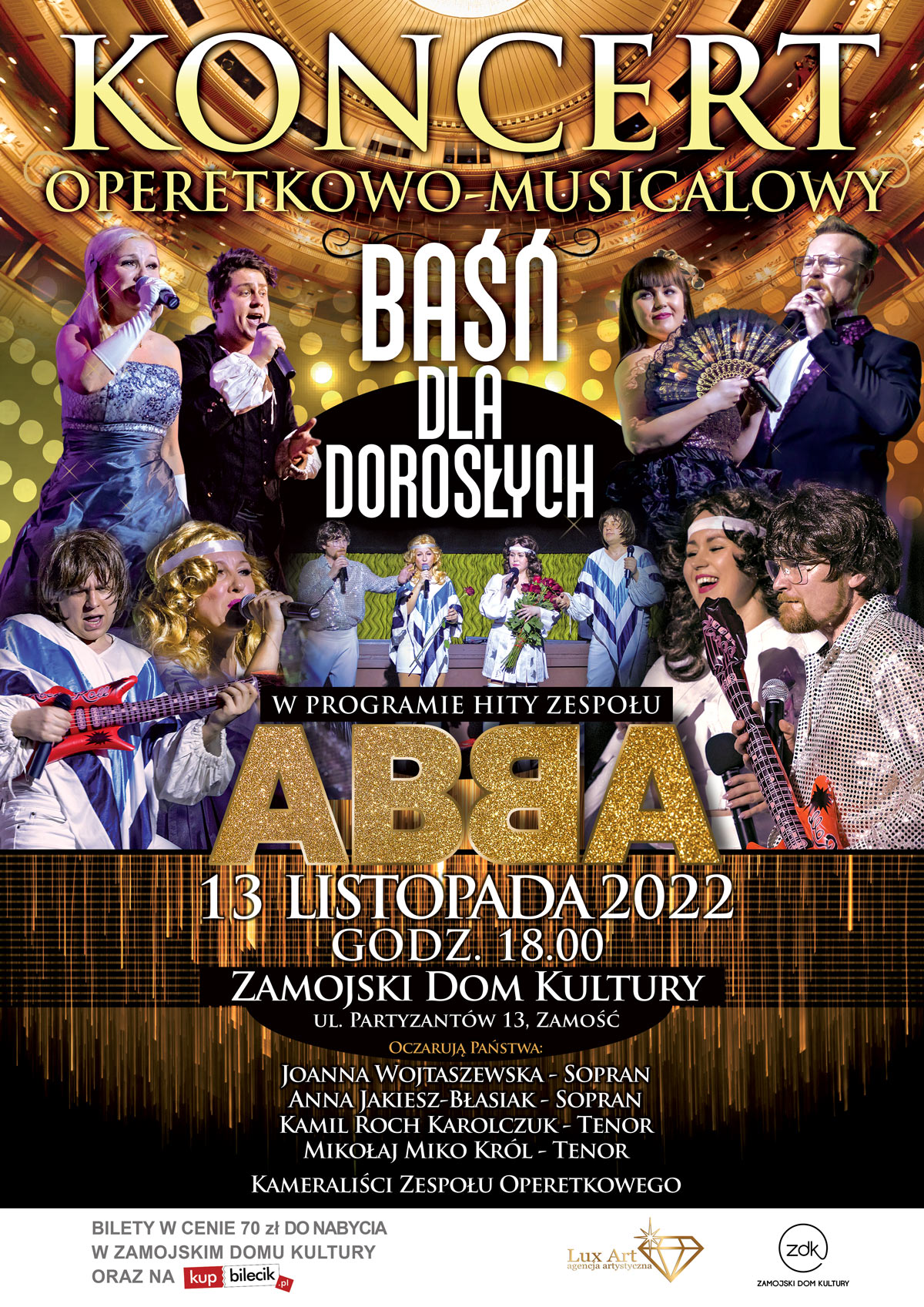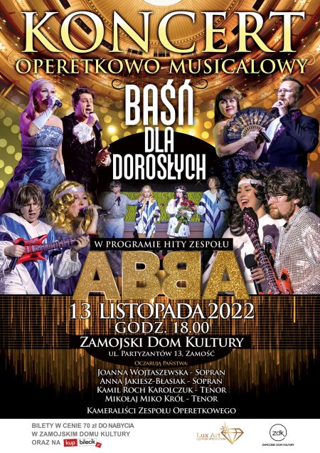 OPERETKA & MUSICAL - Baśń dla dorosłych odbywa się w całej Polsce. Za sprawą wspaniałych artystów przeniosą się Państwo do cudownego i wyjątkowego świata Operetki i Musicalu, pełnego miłości, czułości, wzruszeń, namiętności, gorących pocałunków... Usłyszycie Państwo najpiękniejsze i najznakomitsze melodie muzycznego króla walca Johanna Straussa jak również Emmericha Kalmana, Franza Lehara, Paula Abrahama. Zabrzmią duety wszech czasów: "Usta milczą, dusza śpiewa", "W rytm walczyka", "Myszko, to była piękna noc", wspaniałe arie, popisowe utwory instrumentalne, jak i piosenki z repertuaru Jana Kiepury: "Brunetki, blondynki" oraz duety musicalowe, a to wszystko podane na najwyższym poziomie. Gwiazdą wieczoru i wisienką na torcie są hity legendarnego Zespołu ABBA. Gala cieszy się wielkim powodzeniem i uznaniem, za sprawą porywających solistów, ich poruszającej i subtelnej gry scenicznej, tańca, fantastycznego kontaktu z publicznością oraz wdzięku i uroku osobistego a do tego niesamowitej wrażliwości oraz muzykalności. Repertuar zaczerpnięty z najbardziej znanych i lubianych Operetek oraz Musicali, takich, jak: "Księżniczka Czardasza", "Wesoła Wdówka", "Baron Cygański", "My Fair Lady" czy "Upiór w Operze". Śpiewakom towarzyszą wspaniali Kameraliści Operetkowi, składający się z wybitnie uzdolnionych artystów nowego pokolenia muzycznego. Koncert jest dedykowany każdemu, kto kocha piękną, melodyjną muzykę i jest gotów by szeroko otworzyć swe serce na nowe, muzyczne i nie tylko, doznania. Zapraszamy do wspólnego muzykowania. Do zobaczenia i usłyszenia.