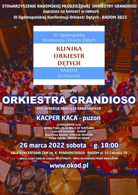 Zapraszamy na koncert w ramach III Ogólnopolskiej Konferencji Orkiestr Dętych 2022, podczas którego wystąpią Mistrzowie Polski 2021 - Radomska Młodzieżowa Orkiestra Dęta Grandioso pod dyrekcją Dariusza Krajewskiego