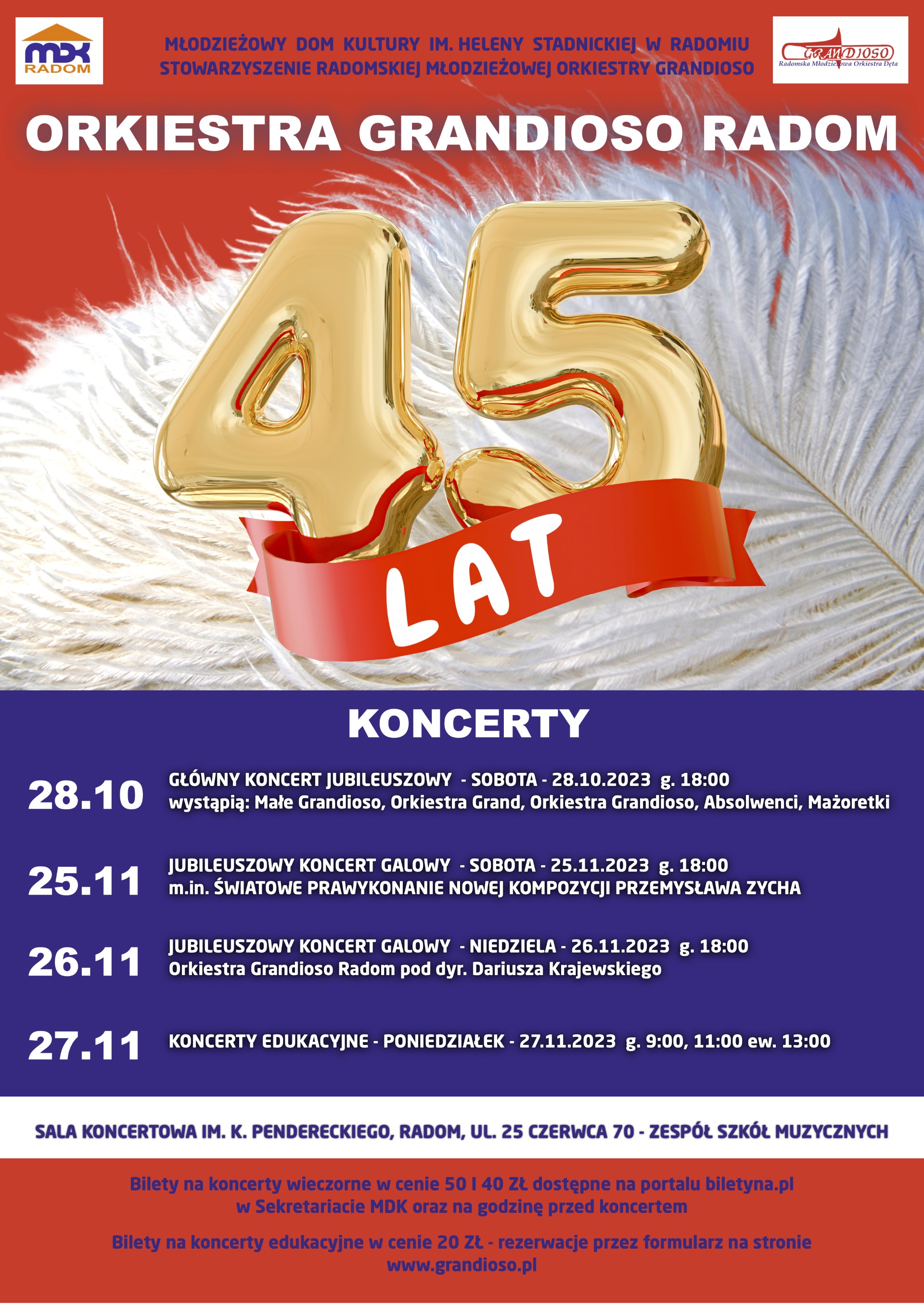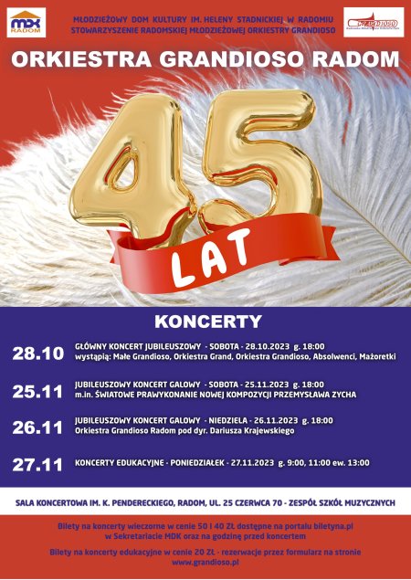 SOBOTA - 25.11.2023 g. 18:00 - JUBILEUSZOWY KONCERT GALOWY wystąpi Radomska Młodzieżowa Orkiestra Grandioso pod dyrekcją Dariusza Krajewskiego oraz Mażoretki i grupa Props.
