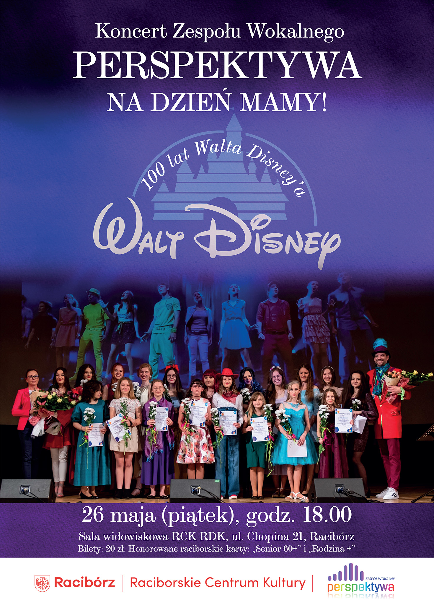 Z okazji Dnia Matki zapraszamy na koncert Zespołu Wokalnego PERSPEKTYWA, który przeniesie do świata bajek Disneya całe rodziny. Bo kto nie chciałby powrócić do czasów dzieciństwa i przypomnieć sobie klimat tych przepięknych filmowych i muzycznych obrazów disneyowskich produkcji.