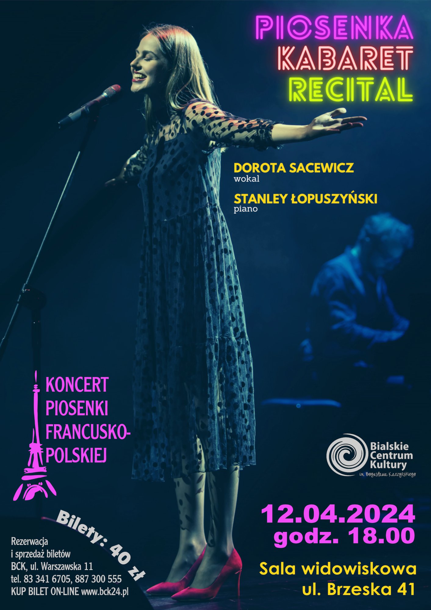 PIOSENKA, KABARET, RECITAL to koncert, podczas którego dwójka artystów, Dorota Sacewicz i Stanisław Łopuszyński, zaprezentują wybrane przez siebie utwory z repertuaru polskiego i francuskiego (między innymi piosenki napisane dla Kaliny Jędrusik, czy Edith Piaf). Pochodząca z Białej Podlaskiej Dorota Sacewicz zaprezentuje również utwory ze swojej autorskiej płyty "Pensées nocturnes".
