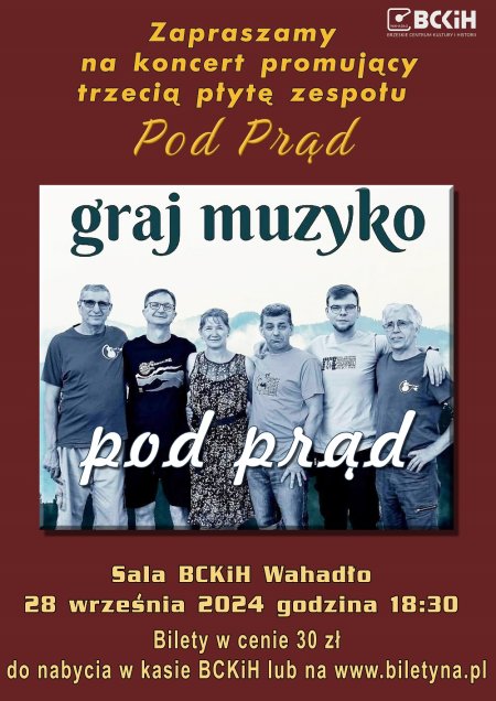 Koncert zespołu POD PRĄD, który będzie promocją najnowszej płyty zespołu "Graj Muzyko". Wielokrotnie nagradzani, wciąż w koncertowej podróży, tworzą autorską muzykę stając się kluczowym zespołem nurtu piosenki turystycznej.
