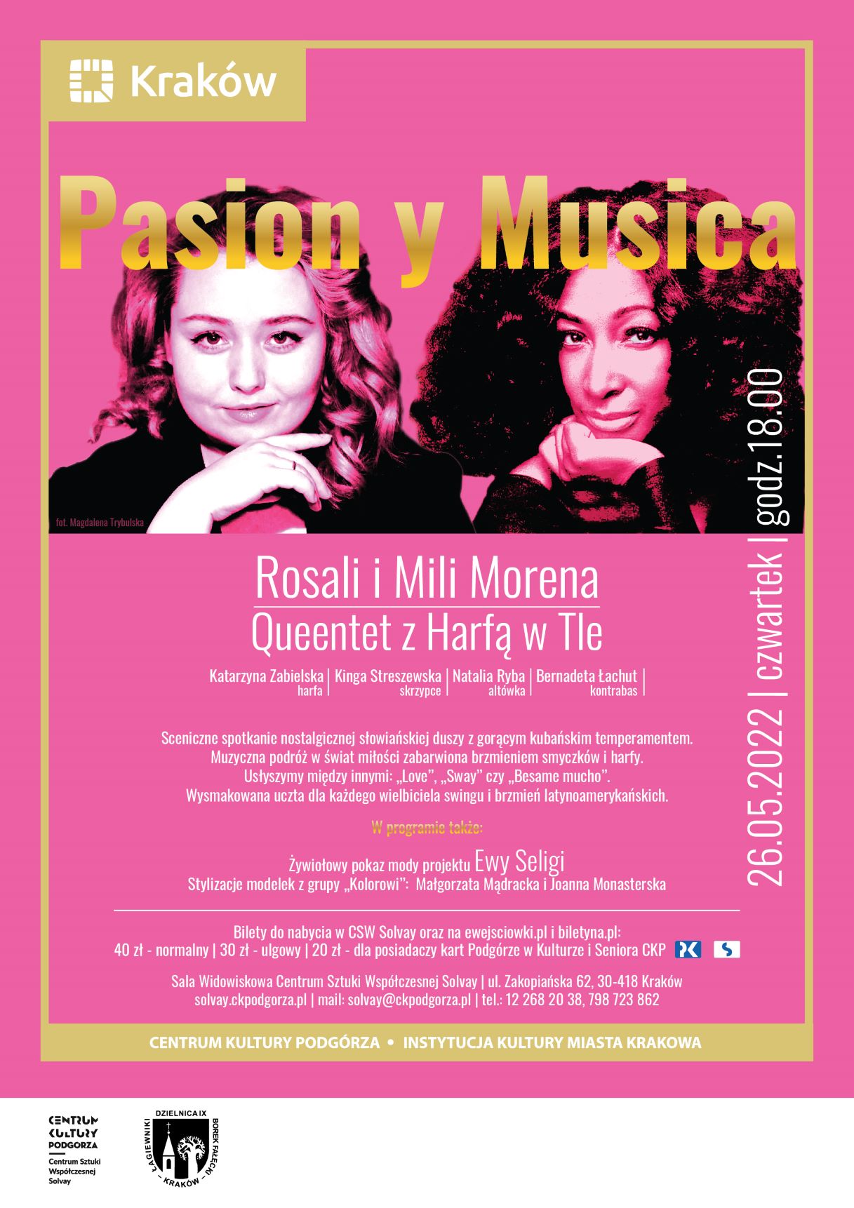 Sceniczne spotkanie dwóch głosów – Rosali o słowiańskiej duszy oraz Mili Morena z kubańskim temperamentem. Artystki zaproszą nas w muzyczną podróż opowiadając o miłości, zabarwionej brzmieniem smyczków i eterycznością harfy. Usłyszymy takie utwory jak „Love”, „Sway”, „Besame mucho”- jednym słowem wysmakowana uczta dla każdego wielbiciela swingu i brzmień latynoamerykańskich.