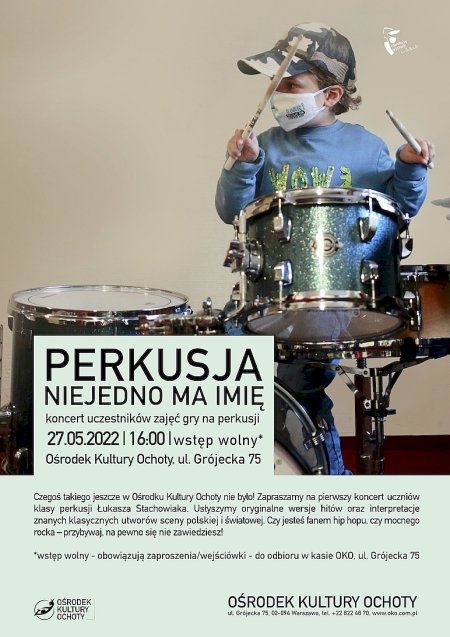 Czegoś takiego jeszcze w Ośrodku Kultury Ochoty nie było! Zapraszamy na pierwszy koncert uczniów klasy perkusji Łukasza Stachowiaka. Usłyszymy oryginalne wersje hitów oraz interpretacje znanych klasycznych utworów sceny polskiej i światowej. Czy jesteś fanem hip hopu, czy mocnego rocka - przybywaj, na pewno się nie zawiedziesz!
