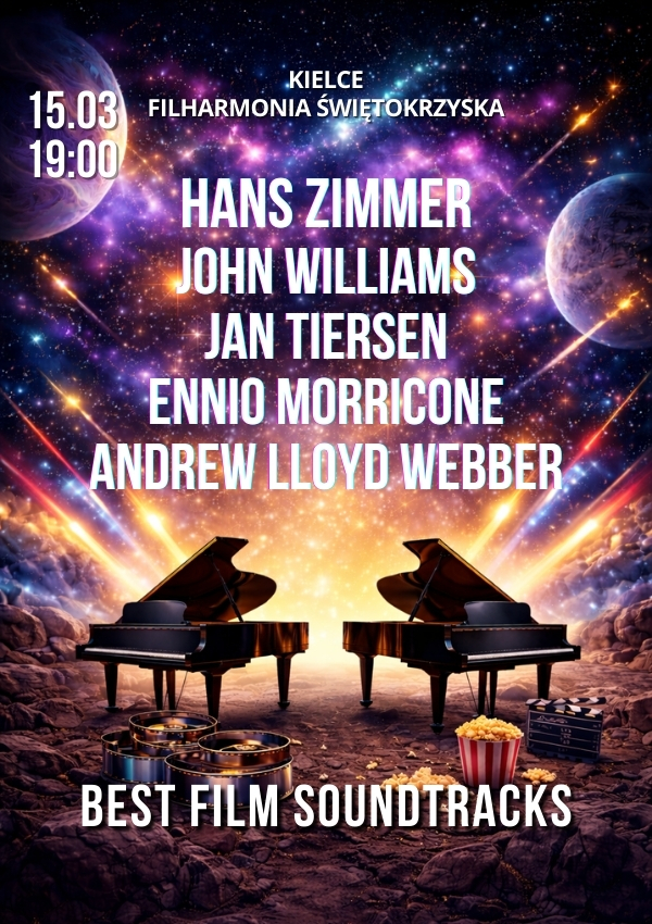 W kameralnej, nastrojowej scenerii, rozświetlonej tysiącem świec, zabrzmią najpiękniejsze melodie z wielkiego ekranu. W wyjątkowych aranżacjach „Dombrova Piano Duo” usłyszycie utwory mistrzów muzyki filmowej: Jan Tiersen, Hans Zimmer, John Williams, Andrew Lloyd Webber, Ennio Morricone i inni.