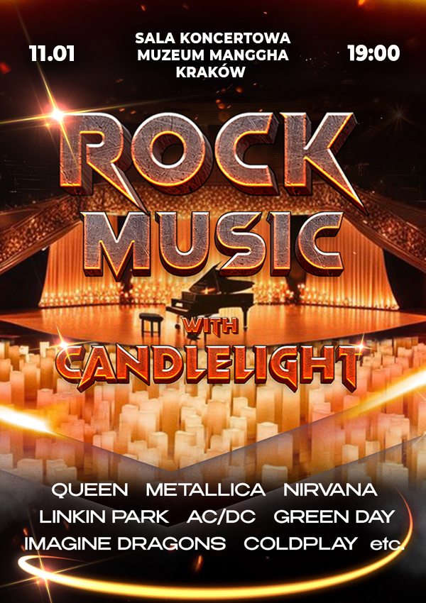 Rock Music with candlelight na scenę sali koncertowej w Muzeum Manggha w Krakowie. Tego wieczoru zaprezentujemy magiczny koncert przy świetle tysiąca świec, podczas którego legendarne rockowe utwory zabrzmią w wykonaniu „Piano&Cello”. Czekają na Ciebie najsłynniejsze przeboje muzycznych gigantów, takich jak Queen, Metallica, Nirvana, Linkin Park, AC/DC, Green Day, Imagine Dragons, Red Hot Chili Peppers, John Lennon i inni.