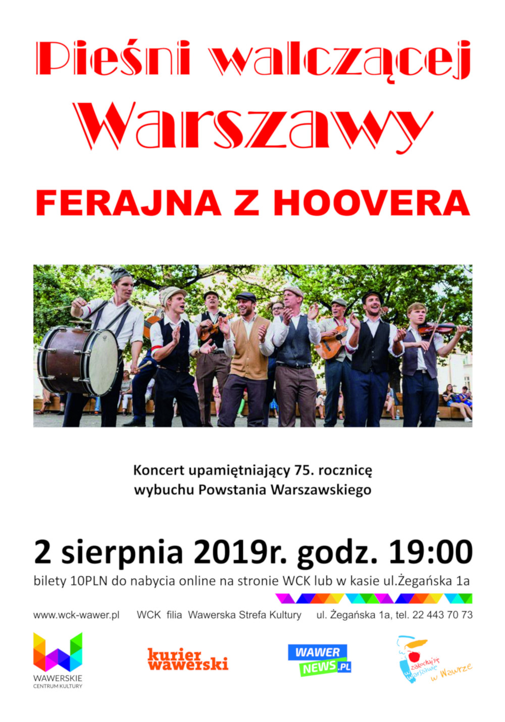 Zapraszamy na koncert "Pieśni walczącej Warszawy" upamiętniający 75. rocznicę wybuchu Powstania Warszawskiego. Wystąpi zespół Ferajna z Hoovera. Grupa znajomych, która spontanicznie połączyła swoje muzyczne talenty, by oddać hołd warszawskim powstańcom i obrońcom niepodległości. Ciepły odbiór publiczności na ich występy sprawił, że grają do dziś przybliżając słuchaczom piosenki powstańcze, okupacyjne, a także utwory patriotyczne czy legionowe. Okrzyknęli się Ferajną z Hoovera, gdyż to właśnie na skwerze Hoovera przy Krakowskim Przedmieściu można spotkać ich w najważniejsze rocznice dla Państwa i miasta. Warszawiacy, patrioci, a przede wszystkim przyjaciele.