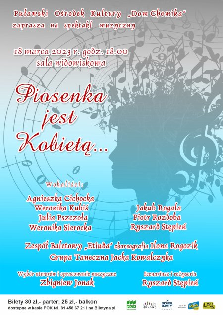 Spektakl muzyczny „Piosenka jest kobietą” już 18 marca o godz. 18:00 w sali widowiskowej POK „Dom Chemika”. Bilety w cenie 30 zł (parter) i 25 zł (balkon) dostępne w kasie POK tel.: 81 458 67 21 i na Biletyna.pl.