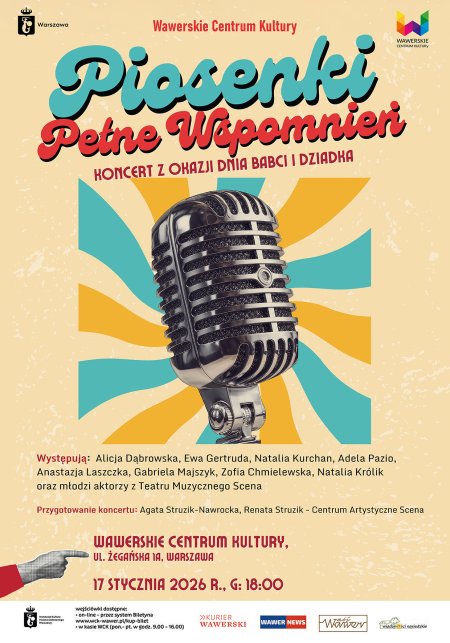 Koncert "Piosenki pełne wspomnień" to muzyczny prezent z okazji Dnia Babci i Dziadka. Piosenki w wykonaniu młodych artystów przeniosą publiczność w czasie i przypomną przeboje artystów takich jak: Anna Jantar, Kabaret Starszych Panów, Andrzej Zaucha, Alicja Majewska i inne.