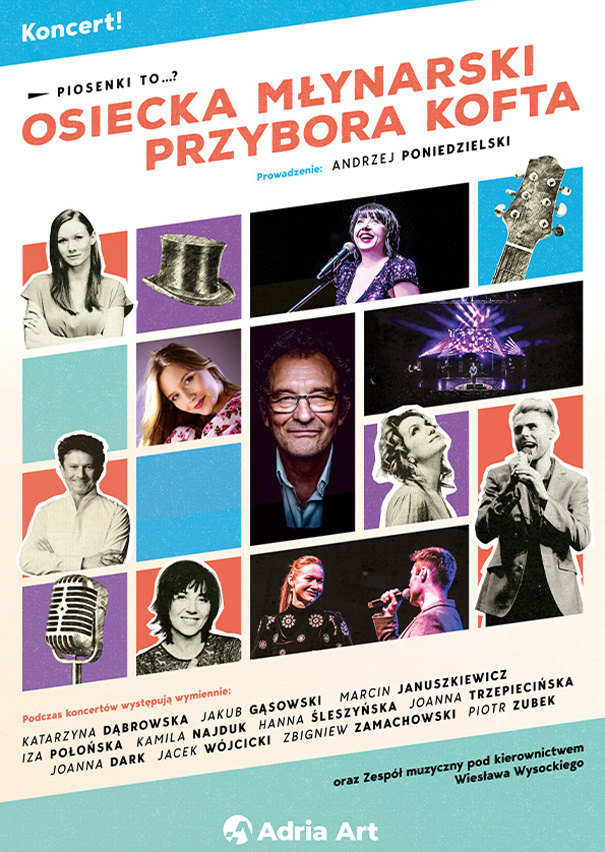 „Piosenki to…? – koncert Osiecka, Młynarski, Przybora, Kofta” to wydarzenie, które zapadnie Państwu w pamięć jako wspaniała, nostalgiczna podróż wśród dzieł wirtuozów polskiej piosenki.