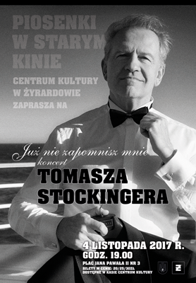 Centrum Kultury w Żyrardowie zaprasza na piosenki w starym kinie w wykonaniu Tomasza Stockingera przy akompaniamencie fortepianowym Stefana Gąsienieca. Koncert pt. „Już nie zapomnisz mnie” odbędzie się 4 listopada 2017 roku o godzinie 19:00 w Sali Widowiskowej Centrum Kultury w Żyrardowie (Plac Jana Pawła II nr 3, 96-300 Żyrardów).
