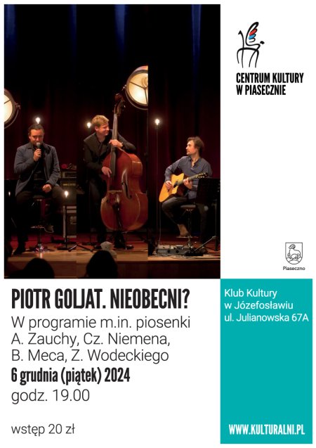 Koncert „Nieobecni?”, to projekt poświęcony pamięci artystów, których zabrakło wśród Nas. Muzycy zaprezentują utwory: Andrzeja Zauchy, Bogusława Meca, Zbigniewa Wodeckiego oraz autorskie kompozycje Piotra Goljata do słów: Juliana Tuwima, Jonasza Kofty i Jerzego Kozarzewskiego.