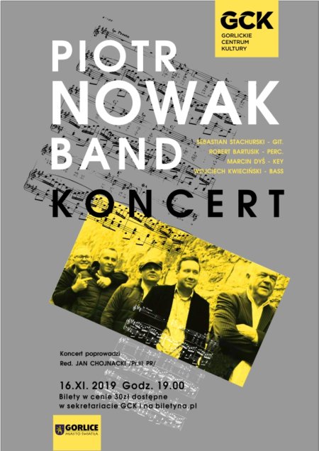 Gorlickie Centrum Kultury ma zaszczyt zaprosić na koncert grupy Piotr Nowak Band, który odbędzie się 16 listopada 2019, o godzinie 19:00, w Sali widowiskowej GCK.