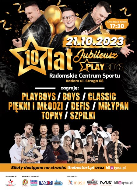 🎂Jubileusz - 10 lat zespołu Playboys - najgorętsza impreza jesieni 2023 r.‼️🎂 O sukcesie największej tego typu gali w Radomiu z pewnością zaważą gwiazdy wieczoru, które dadzą z siebie wszystko, aby zadowolić głodną hitów publiczność. W ten październikowy wieczór tysiące serc fanów muzyki tanecznej będzie biło dużo mocniej, na scenie pojawią się niekwestionowane gwiazdy takie jak: Boys, Classic, Playboys, Piękni i Młodzi, Defis, Miły Pan, Topky oraz Szpilki‼️🎤 Widzimy się na koncercie‼️🎤🎟️