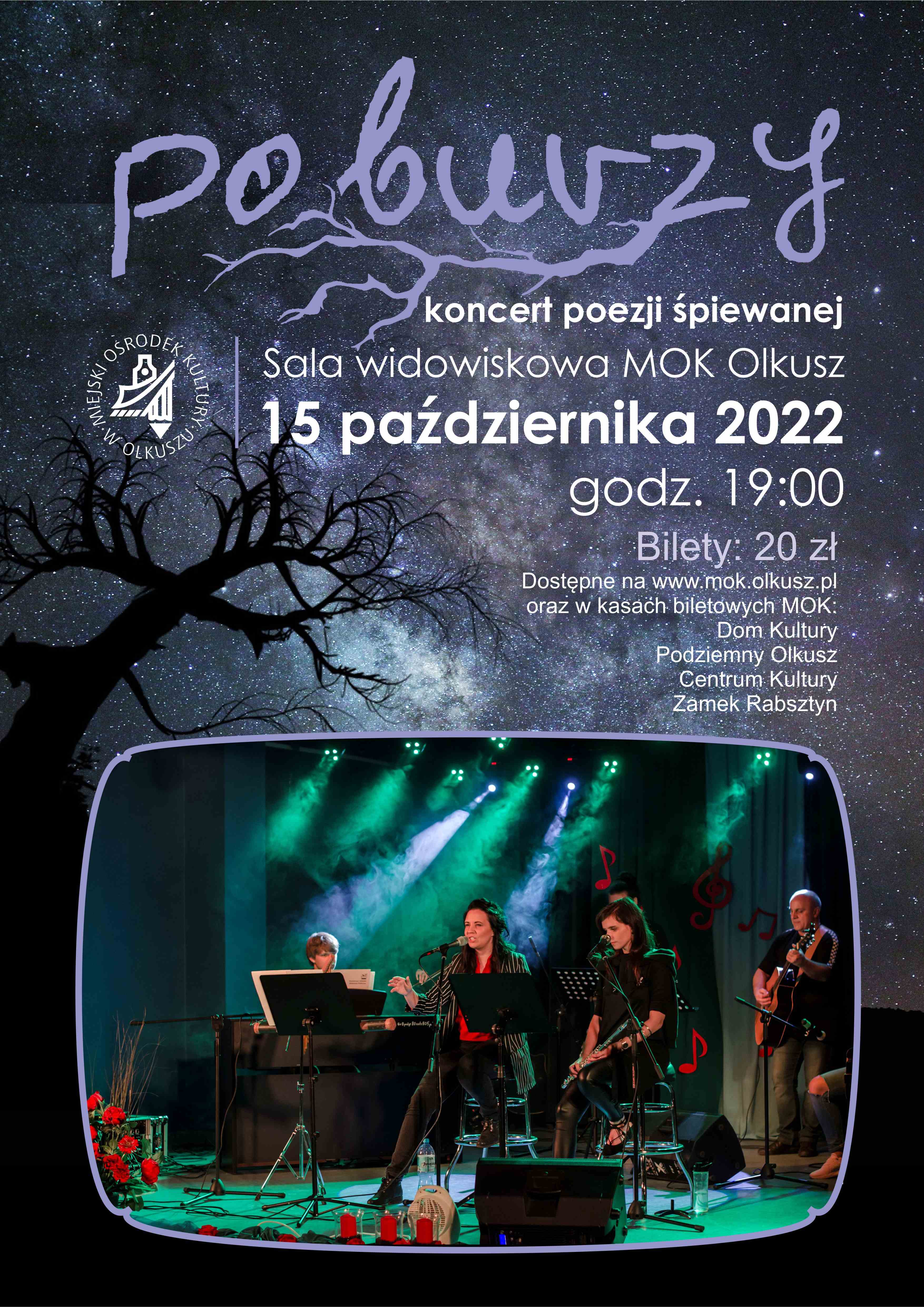 15 października 2022 roku w sali widowiskowej MOK Olkusz, o godz. 19:00 odbędzie się koncert poezji śpiewanej w wykonaniu zespołu “Po burzy”.