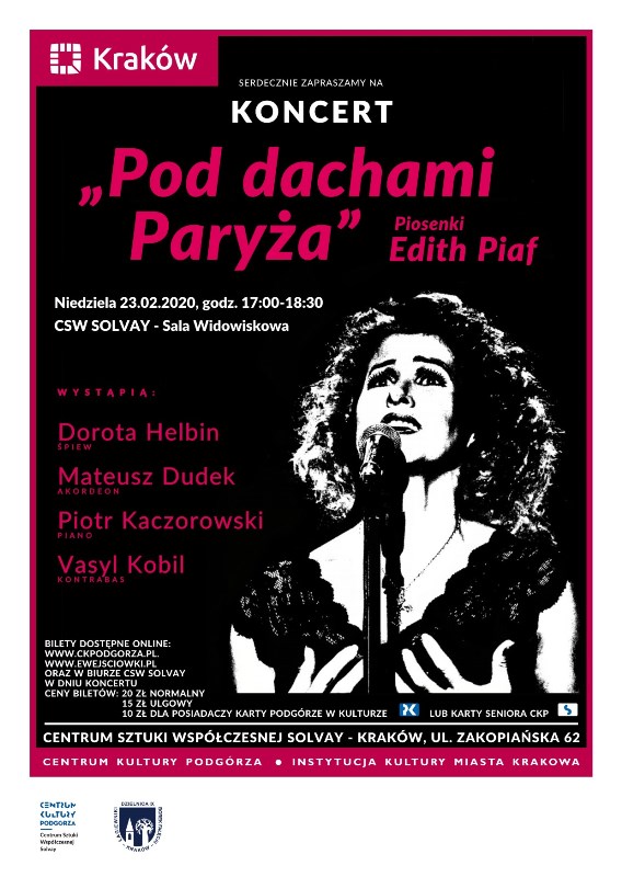 Kameralny koncert "Pod dachami Paryża" to wieczór w blasku świec, w muzycznym klimacie lat 50-tych. W repertuarze piosenki Edith Piaf oraz autorskie tanga i rumby. Magia głosu i akordeonu.
