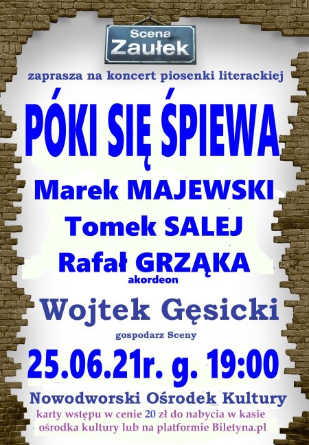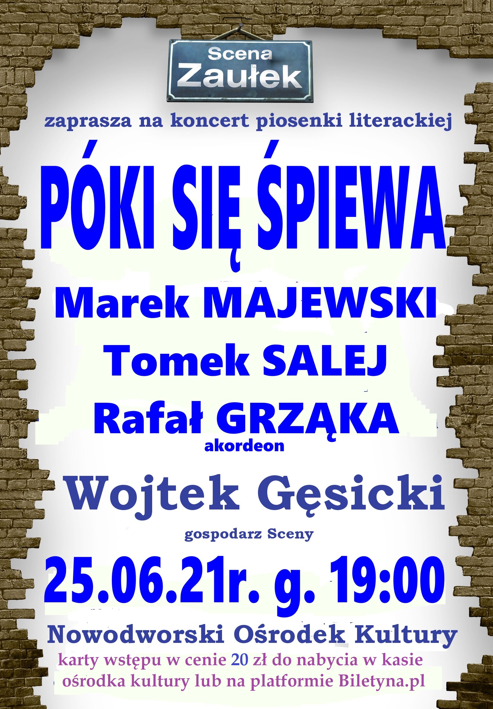 PÓKI SIĘ ŚPIEWA, to tytuł z finałowej piosenki Jaromira Nohavicy w tłumaczeniu Marka Majewskiego - satyryka, szantymena, poety. "Póki się śpiewa, jeszcze umierać nie czas" - z tym przesłaniem będziemy gościć Państwa na Scenie Zaułek, której gospodarzem jest Wojtek Gęsicki. W programie usłyszymy jak zwykle piosenki do uśmiechu, a także do refleksji. W czasach, kiedy spotkanie dla "ducha" stało się rarytasem, wraz z Tomkiem Salejem (olsztyńskim bardem o zabarwieniu satyrycznym), Markiem Majewskim, a także z wirtuozem akordeonu - Rafałem Grząką, postaramy się nadrobić ten czas rozłąki z Państwem.