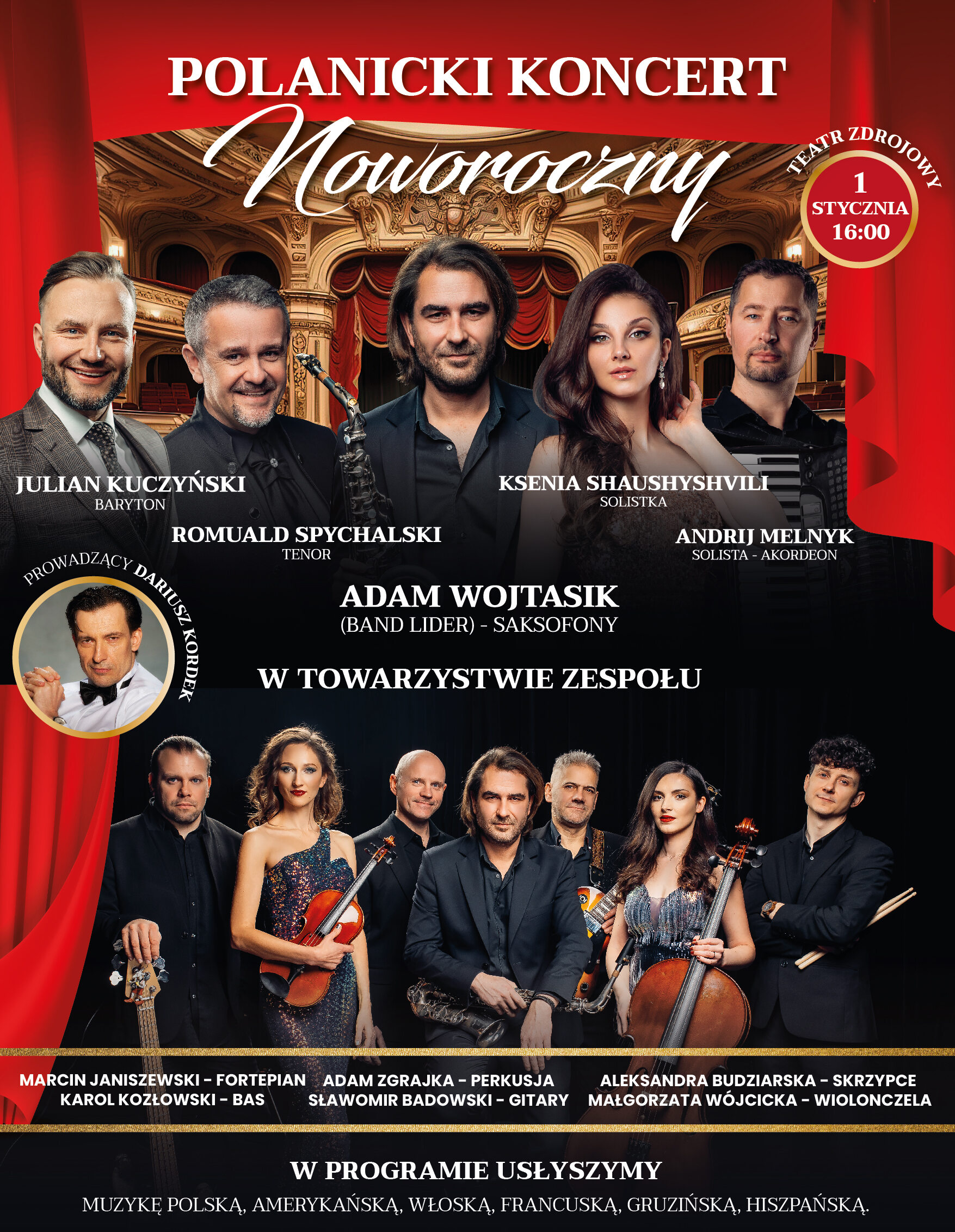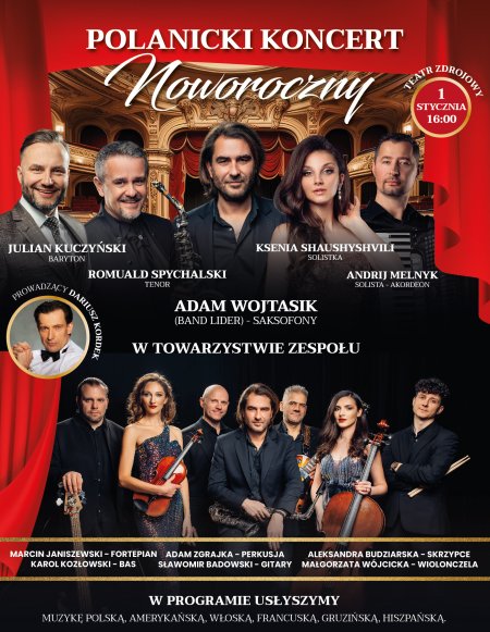Polanicki Koncert Noworoczny . To kolejny z serii koncertów pod hasłem od Operetki po Hity Muzyki Estradowej. Tegoroczną Galę poprowadzi słowem jak i śpiewem znany i lubiany aktor Dariusz Kordek ! W tę Muzyczną podróż zabierze Nas wyjątkowa, 10 osobowa grupa muzyków i solistów pochodząca z różnych krajów Europy. Wyjątkowe aranże , nieznane dotąd wersje znanych i uwielbianych utworów usłyszymy i zobaczymy na żywo !!!Usłyszymy nowy repertuar, utwory pochodzące z USA, Irlandii, Gruzji, Hiszpanii, Francji, Włoch i wielu innych krajów. Nieznane dotąd wersje znanych i uwielbianych utworów usłyszymy i zobaczymy na żywo !!! � Czas : 110 min. plus bis i wiele innych, które pozostaną niespodzianką do dnia koncertu.