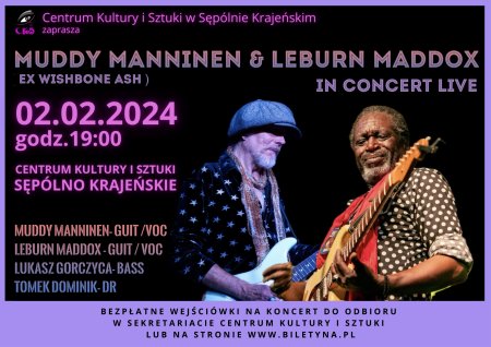 Mamy dobre wiadomości dla miłośników gitarowej muzyki. Znany sępoleńskiej publiczności duet Łukasz Gorczyca i Tomasz Dominik wracają do nas ze znakomitymi goścmi. Panom podcza kolejnej wizyty w CKiS towarzyszyć będą Muddy Maninen – jeden z najlepszych europejskich gitarzystów blues rockowych. Przez lata związany z legendarnym zespołem Wishbone Ash oraz Leburn Maddox – gitarzysta, który przez wiele lat współpracował z wytwórnią Atlantic Records i w swojej bogatej karierze otwierał koncerty takich tuzów, jak John Lee Hooker, Albert Collins, Joe Lewis’s Walker, Joe Bonamassa czy Jeff Healy.