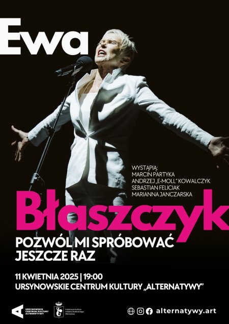 Znakomita aktorka, laureatka wielu prestiżowych nagród i założycielka fundacji „Akogo?”, zaprezentuje wyjątkowy wybór utworów najwybitniejszych polskich i światowych twórców. W repertuarze znajdą się kompozycje między innymi Agnieszki Osieckiej, Jacka Kleyffa, Stanisława Soyki, Doroty Czupkiewicz, ks. Jana Twardowskiego, Marii Pawlikowskiej-Jasnorzewskiej, Jana Wołka oraz Jacka Janczarskiego, do których muzykę skomponował Jerzy Satanowski. Będzie to wieczór pełen refleksji i wzruszeń, podczas którego muzyka i słowo splotą się w poruszającą opowieść. Ewa Błaszczyk, interpretując te utwory w niezwykle osobisty sposób, stworzy intymną atmosferę, w której każda nuta i każde słowo nabiorą głębokiego znaczenia. Artystce towarzyszyć będą: Marcin Partyka (instrumenty klawiszowe), Andrzej „e-moll” Kowalczyk (gitara, śpiew), Sebastian Feliciak (saksofony) oraz Marianna Janczarska (gitara, śpiew).