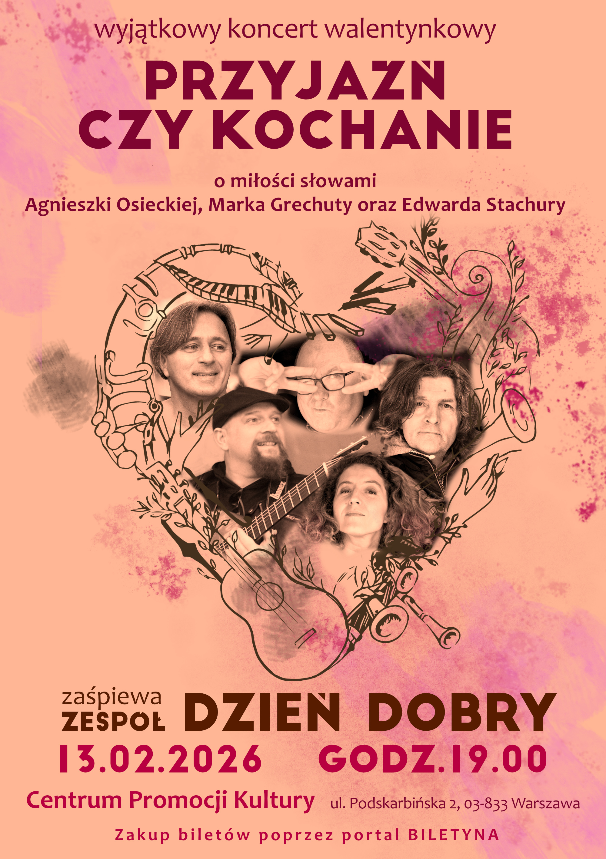 💖 "Przyjaźń czy kochanie" to walentynkowy koncert pełen emocji – miłość i przyjaźń w słowach mistrzów: Marek Grechuta, Agnieszka Osiecka i Wojciech Młynarski. 🎶 Zespół Dzień Dobry porwie Cię pozytywną akustyczną energią – idealny wieczór we dwoje (lub z przyjaciółmi)! 🌹🎟️