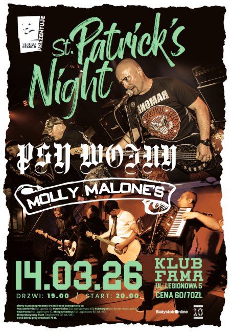 No cześć Mordy 🙂 Stało się! PSY WOJNY w zeszłym roku celebrowały 40-stkę, ale przez te 4 dekady NIGDY nie odwiedziły Białegostoku. Postanowiliśmy to zmienić i zaprosić ich na recital. Drugi zespół, to doskonale Wam znany gwiazdor celtyckiego folk panka - MOLLY MALONE'S, który wraca do nas po dwuletniej przerwie. Szykuje się pankowo folkowy Patryk, jakiego nasza cudna, podlaska ziemia jeszcze nie widziała. Dyskoteka będzie cacy, a tańce jak ta lala! Do zobaczenia w zdrowiu 🙂