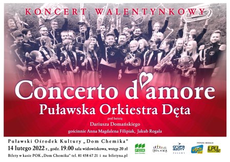 W programie specjalnego walentynkowego wieczoru, znajdą się energetyczne, romantyczne ale też nastrojowe utwory o miłości, takie jak tytułowy „Concerto d'amore”, motyw muzyczny z filmu „Pretty woman”, nieśmiertelny szlagier Dean’a Martin’a „Everybody loves somebody” czy „Heart and soul”, a wszystko to w wyjątkowych, orkiestrowych aranżacjach wykonywanych pod batutą Dariusza Domańskiego, kapelmistrza Puławskiej Orkiestry Dętej.