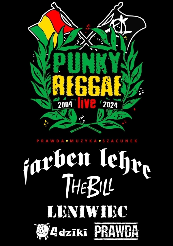 Serdecznie zapraszamy zwolenników pozytywnych wibracji, melodyjnego grania, dobrej zabawy oraz szczerych dźwięków, płynących prosto z serca do aktywnego udziału w jubileuszowej odsłonie trasy PUNKY REGGAE live 2024. Dokładnie 20 lat temu, w 2004 roku ruszyła w Polskę pierwsza edycja PRlive. W związku z powyższym chcemy, aby przyszłoroczne koncerty były z jednej strony kolorową podróżą sentymentalną w przeszłość, a z drugiej stały się przyjemną ucztą dla ucha i ducha jej uczestników. Tym razem na jednej scenie, po wielu latach, spotkają się trzy kapele, które znacząco zapisały się w historii trasy, a mianowicie wiecznie młodzi gospodarze z FARBEN LEHRE, którzy specjalnie na PRlive 2024 szykują kilka niespodzianek oraz wyjątkową setlistę, zasłużona, od lat będąca w świetnej formie koncertowej formacja The BILL i jako trzecia, zawsze optymistycznie nastawiona, mocno energetyczna, tudzież pracowita ekipa spod szyldu LENIWIEC. Melodyjny punk-rock, żywiołowa brawura, przyprawione szczyptą pozytywnych wibracji w klimatach reggae & ska, to muzycznie wybuchowy krem, jaki zaserwują wszystkie podmioty, grające na PUNKY REGGAE live 2024. Tradycyjnie, na każdym z planowanych koncertów, w charakterze gościa-supportu wystąpi czwarty, zaproszony zespół. Natomiast w dwóch miastach (Warszawa & Kraków) na scenie pojawi się łącznie 6 kapel (FARBEN LEHRE, THE BILL, LENIWIEC, AKURAT, GUTEK & ZENEK KUPATASA). Zasada jest taka, aby wszystkie zaproszone podmioty, w przeszłości miały swój aktywny udział w trasie PRlive. Jubileuszowa edycja wystartuje w piątek, 16 lutego 2024, a finałowy koncert odbędzie się w sobotę, 20 kwietnia. Łącznie planujemy zagrać 20 koncertów na XX-lecie, zatem będzie się działo niemało… Na mapie pojawią się miasta, od lat rokrocznie odwiedzane, jak również takie, w których jakiś czas nas nie było, a nawet udało nam się znaleźć dwie lokalizacje, w których trasa PUNKY REGGAE live zawita po raz pierwszy w historii. Wiadomość z ostatniej chwili jest taka, że wszyscy uczestnicy są głodni wyjścia na scenę, kapele ładują swoje akumulatory i baterie, co sugeruje, że energii na przyszłorocznej trasie z pewnością nie zabraknie
