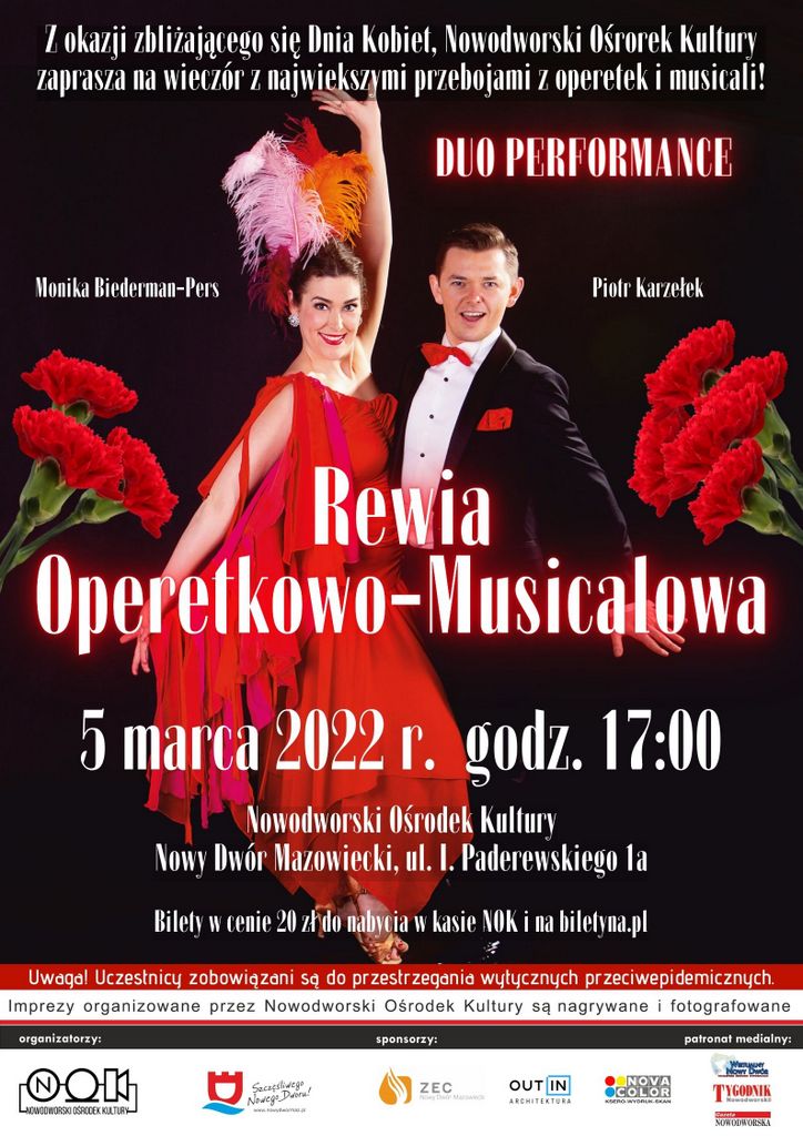 Z okazji zbliżającego sie Dnia Kobiet, Nowodworski Ośrodek Kultury zaprasza na wieczór przepełniony największymi przebojami z operetek wszechczasów, walcami, czardaszami i tańcem, oraz wspaniałym śpiewem solistów z DUO PREFORMANCE. W repertuarze znajdą się fragmenty z operetek takich twórców, jak Abraham, Kalman, czy Strauss oraz arie, duety i sceny z takich przebojów, jak: „Księżniczka Czardasza”, „Baron Cygański”, „Wesoła Wdówka”, „Bal w Savoyu”, ”Clivia” i wiele innych.
