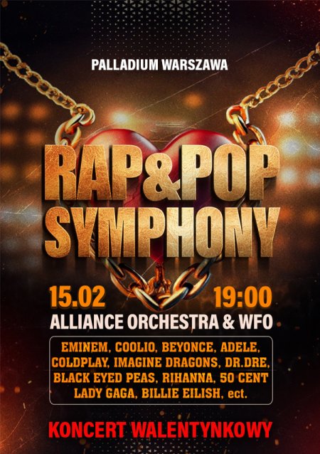 Drodzy melomani, z okazji Walentynek z wielką przyjemnością przedstawiamy świąteczny koncert "Rap & Pop Symphony". W ten wyjątkowy dzień zapraszamy w muzyczną podróż w nowy świat ulubionych piosenek z gatunku Rap i Pop, które zabrzmią w wykonaniu orkiestry symfonicznej. W programie koncertu przygotowaliśmy symfoniczne aranżacje znanych hitów z repertuaru: Eminem, Coolio, Black Eyed Peas, Rihanna, Coldplay, Imagine Dragons, Beyonce, Adele, Dr.Dre, Lady Gaga, Billie Eilish, Christina Aguilera, Sting, Roxette i wielu innych. Specjalnie dla miłośników muzyki wspaniały romantyczny program dopełnią również orkiestrowe wersje legendarnych utworów "Zombie", "It's Raining Men", "Beggin", "I Will Always Love You" i oczywiście "Don't Speak". Przygotuj się na koncert pełen nostalgii i przyjemnych emocji.