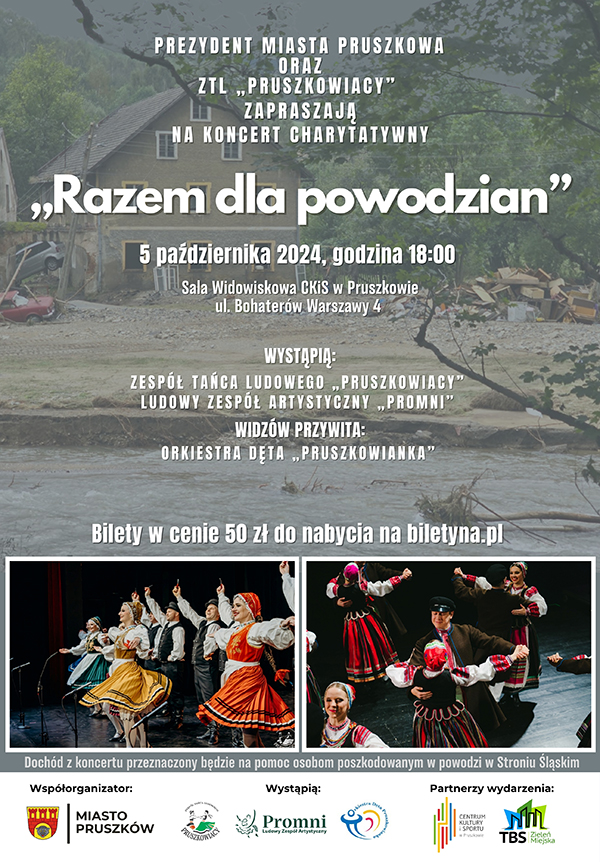 Zespół Tańca Ludowego „Pruszkowiacy” we współpracy Prezydentem Miasta Pruszkowa postanowił zorganizować koncert charytatywny „Razem dla powodzian”. Na nasze zaproszenie do wspólnego występu bez chwili wahania odpowiedział Ludowy Zespół Artystyczny „Promni” Szkoły Głównej Gospodarstwa Wiejskiego w Warszawie. W akcję włączyła się także Orkiestra Dęta „Pruszkowianka”, która zagra w holu głównym CKiS przed rozpoczęciem koncertu.