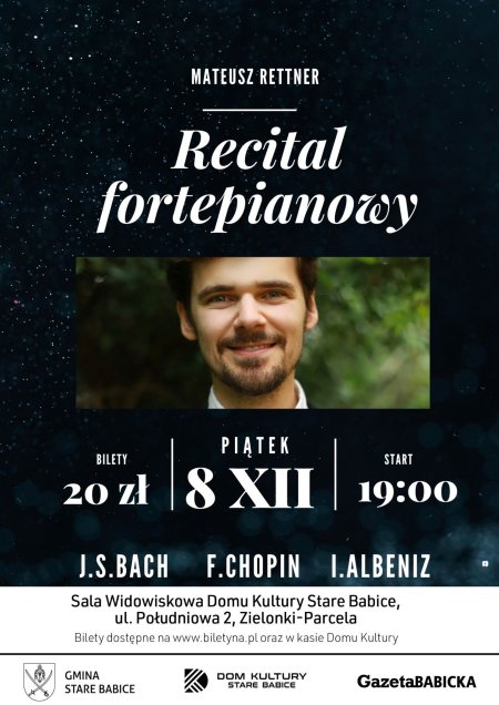 Serdecznie zapraszamy na recital fortepianowy Mateusza Rettnera. W programie J.S. Bach, F. Chopin oraz I. Albeniz.