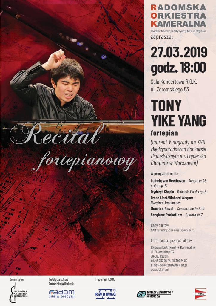 Wyjątkowa okazja by na żywo wysłuchać recitalu wirtuoza fortepianu. Tony Yike Yang (ur. 7 grudnia 1998 r.) to kanadyjski pianista chińskiego pochodzenia. Zaliczany jest do najwybitniejszych pianistów młodego pokolenia. W wieku 16 lat zdobył V nagrodę na XVII Międzynarodowym Konkursie Pianistycznym im. Fryderyka Chopina w Warszawie, tym samym stając się najmłodszym laureatem tego konkursu.