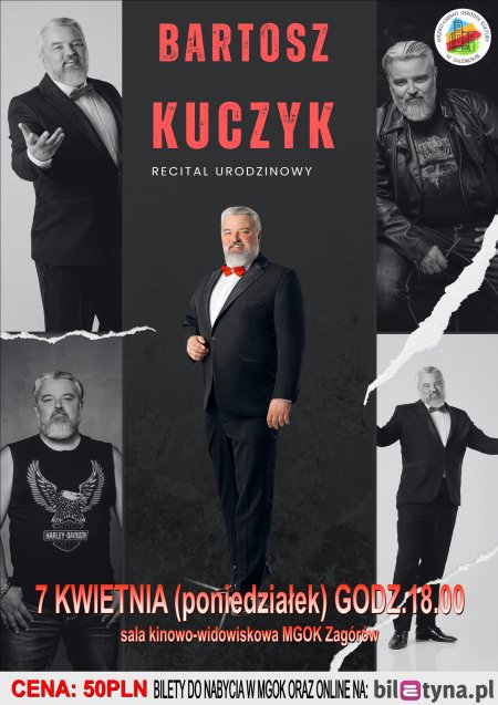 Zapraszamy na recital urodzinowy Bartosza Kuczyka, znanego śpiewaka operowego, który wielokrotnie występował w MGOK Zagórów i za każdym razem kradł serca płci pięknej i budził zachwyt wśród mężczyzn! Wydarzenie odbędzie się 7 kwietnia (poniedziałek) o godz. 18.00 w sali kinowo-widowiskowej MGOK Zagórów. Koszt biletu 50 PLN. Bilet można kupić w kasie MGOK lub na Biletyna.pl.