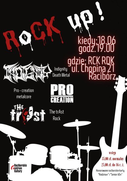 RCK zaprasza na koncert trzech kapel z Raciborza i okolic w ramach RoCK up - u! Zaprezentują się: The trAst, Pro-Creations i Indignity. Zatem będzie rockowo, metalrockowo nawet death metalowo.