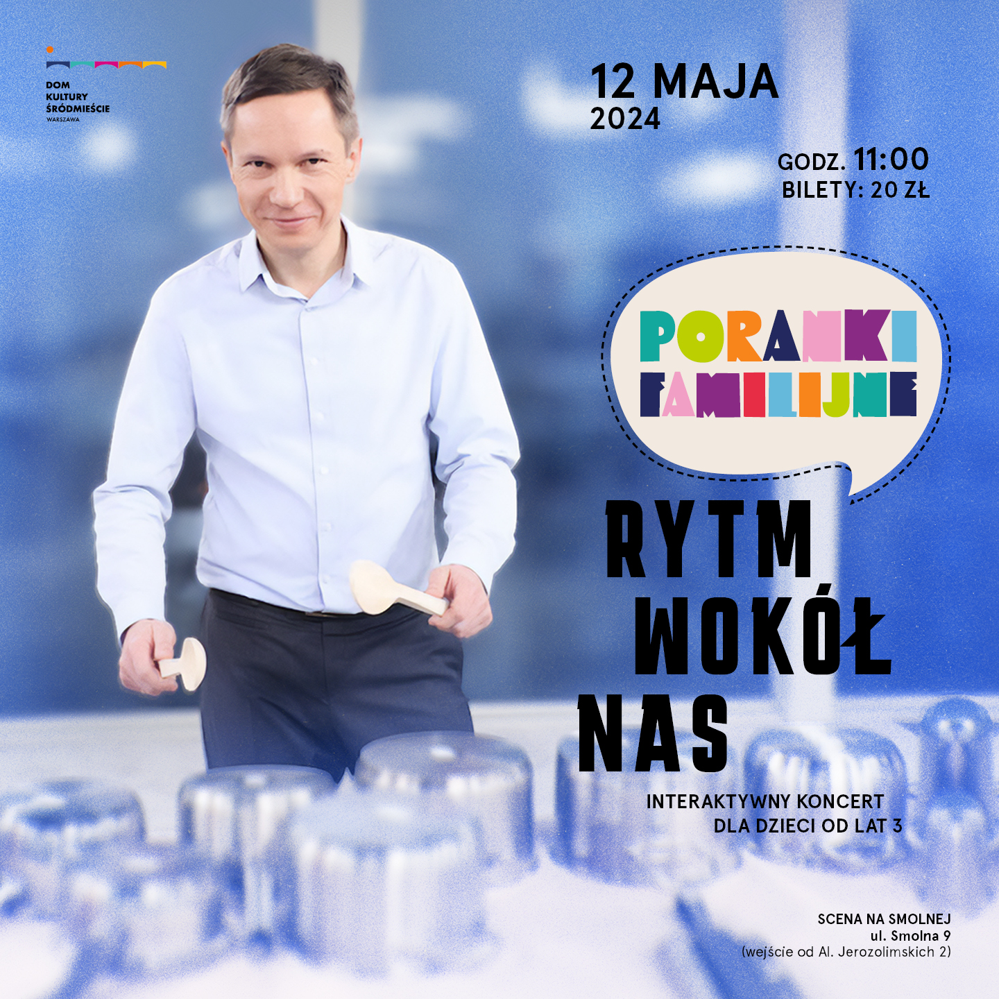 Podczas koncertu poznamy instrumenty tworzące najliczniejszą muzyczną rodzinę na świecie, czyli instrumenty perkusyjne. Będziemy mogli poznać i zagrać rytmy charakterystyczne dla różnych kontynentów, wykonane na pochodzących z nich tak egzotycznych instrumentach, jak choćby popularne w Ameryce Łacińskiej bongosy, maracasy, cajon, czy też na bębny afrykańskie. Poznamy także ksylofon, tom-tom, bęben morze, kij deszczowy, klawesy, oślą szczęka, gadający bęben, bongosy, darabukę, dzwonki czy djambe. Oczywiście nie zabraknie tych używanych współcześnie w orkiestrach symfonicznych, jak werbel, bęben czy ksylofon. I co najważniejsze, podczas prowadzonych przez perkusistę wirtuoza Marcina Lemiszewskiego warsztatów nauczymy się, jak wydobywać z wielu z nich dźwięk, a tym samym w praktyce odtwarzać na perkusji ten najstarszy element muzyki, jakim jest rytm. Będzie przede wszystkim mnóstwo wspólnej muzycznej zabawy i frajdy, bo muzyka to radość i przyjemność.