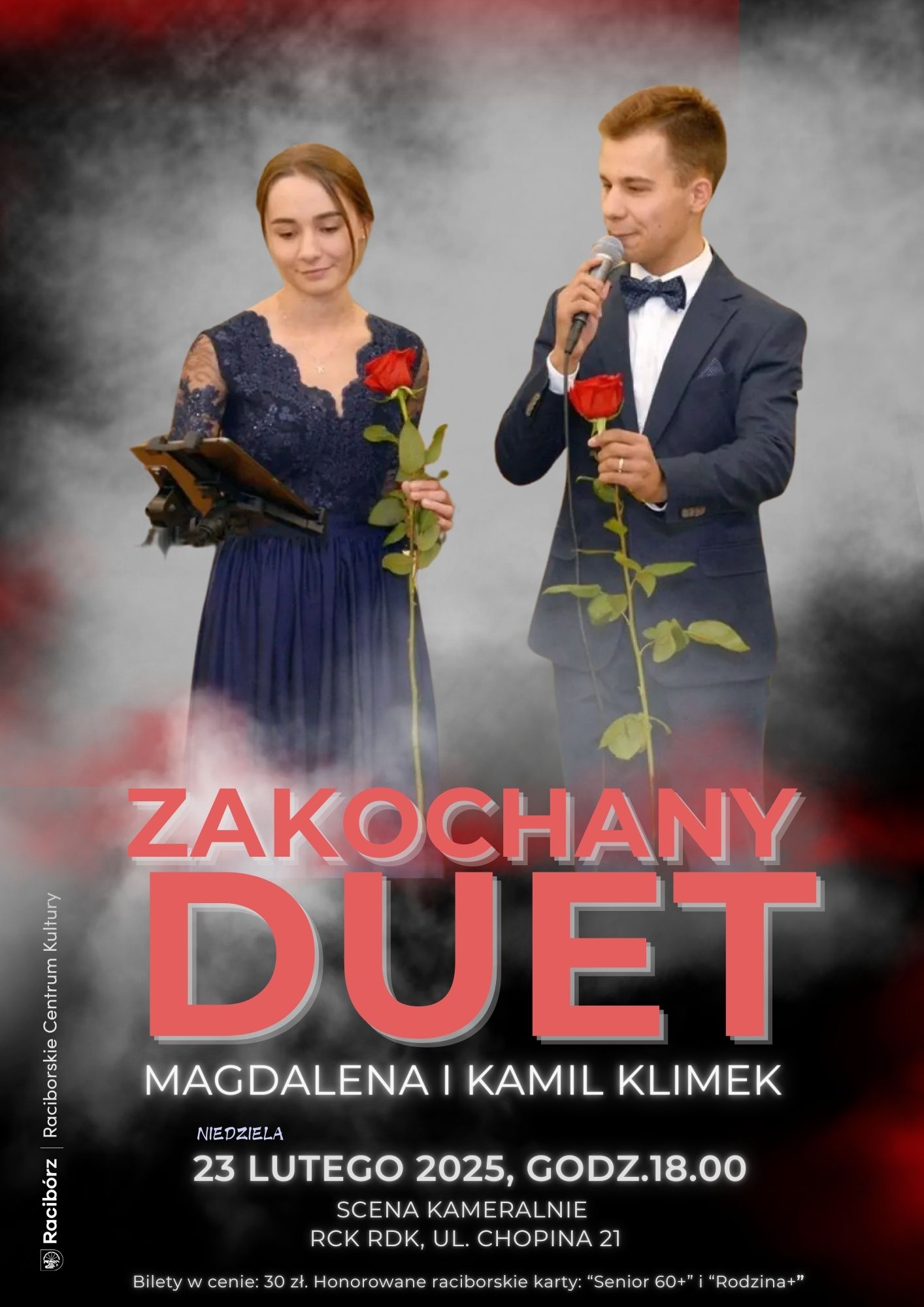 Z Nowym Rokiem powraca cykl kameralnych koncertów na scenie RDK-u, czyli ,,Scena Kameralnie''. Tym razem usłyszymy najpiękniejsze utwory o miłości w wykonaniu duetu nie tylko scenicznego, ale i małżeńskiego: Magdaleny i Kamila Klimek z towarzyszeniem Łukasza Fulneczka na fortepianie .