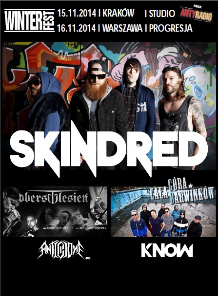 Przygotujcie się na porządną dawkę koncertowej energii!!! LegallART zaprasza Was na WINTERFEST 2014, który odbędzie się 15 listopada w Krakowie w klubie Studio i 16 listopada w Progresji w Warszawie. W tym roku na festiwalu jako główną gwiazdę zobaczycie SKINDRED – zespół reggae-metalowy wielokrotnie nagradzany przez media za najlepsze występy sceniczne. Chłopaki z UK po raz kolejny przyjadą do Polski uruchomić z publiką Newport Helicopter…! ?
