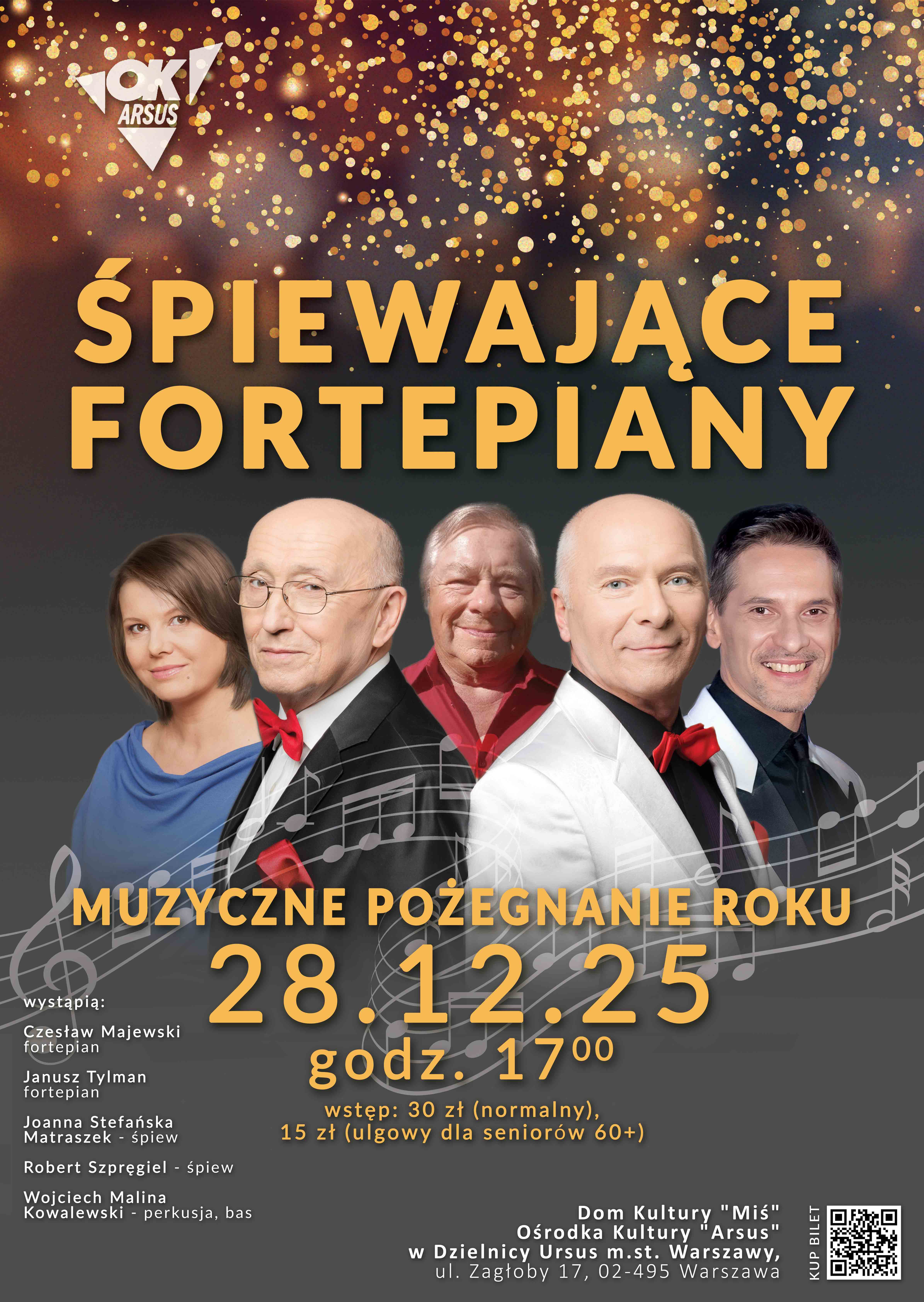 Koncert „Śpiewające Fortepiany – Muzyczne Pożegnanie Roku” to pełne elegancji i humoru spotkanie z przebojami w mistrzowskim wykonaniu Czesława Majewskiego i Janusza Tylmana. Towarzyszą im znakomici wokaliści – Joanna Stefańska-Matraszek i Robert Szpręgiel – oraz Wojciech Malina Kowalewski, który nadaje całości energii rytmiczną sekcją perkusji i basu. To wyjątkowy wieczór, który wprowadza w noworoczny nastrój.