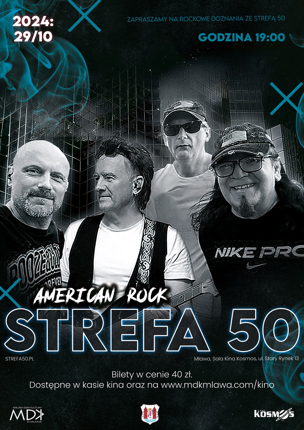 STREFA 50 - AMERICAN ROCK - charyzmatyczny głos lidera połączony z charakterystyczną dla stylu zespołu mieszankę nieśmiertelnego rock&rolla, bluesa, country i folku z pod znaku Creedence Clearwater Revival. Jeśli ktoś zna klimaty z słynnego kinowego hitu “The Blues Brothers” ten wie o co chodzi - Panowie ze Strefy 50 “ mają misję od Boga” i nie zawahają się jej użyć na koncertach. Ich żywioł to duże sceny plenerowe na których sprawdzają się najlepiej. Grali m.in na najsłynniejszym w Polsce Festiwalu Piknik Country w Mrągowie, ale także w Hard Rock Cafe, na zlotach w typie Master Truck, na dużej scenie WOŚP przed Pałacem Kultury czy w Hali Arena także na słynnych deskach Doliny Charlotty. Ich dewiza to“ Pieniądze są ważne, ale nie najważniejsze !!! Dla nas najważniejsza jest muzyka – ona nie podlega negocjacjom! O reszcie możemy dyskutować – nawet o pieniądzach, choć niechętnie bo jesteśmy dżentelmenami . . .”