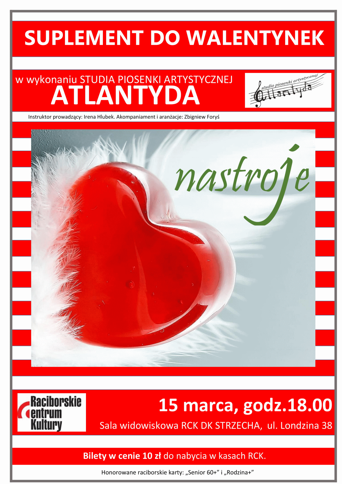 Koncert w wykonaniu Studia Piosenki Artystycznej ATLANTYDA z najpiękniejszymi piosenkami o miłości. W repertuarze utwory m.in. Kory Jackowskiej, Agnieszki Osieckiej, Krystyny Prońko, Justyny Szafran, piosenka poetycka i aktorska oraz wiele innych.