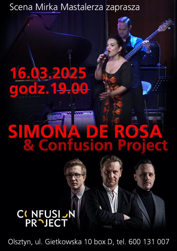 Na najnowszym krążku wątek inspiracji folklorem jest kontynuowany, o czym przekonają się Państwo podczas koncertu w Olsztynie.Simona De Rosa polskiej publiczności pozwoliła się poznać po raz pierwszy wiele lat temu w ramach festiwalu Voicingers w Żorach, potem zaś podczas 12-koncertowej trasy po Polsce latem 2023 roku, którą zagrała wspólnie z Confusion Project, z którym wystąpi w Olsztynie.Confusion Project – (Michał Ciesielski – fortepian, Piotr Gierszewski – gitara basowa, Adam Golicki – perkusja) to trio z pogranicza jazzu/prog-jazzu/jazz fusion, które powstało w 2013 roku w Gdańsku. Liderem tria jest pochodzący z Wejherowa pianista Michał Ciesielski. Od tamtej pory zespół nagrał 4 studyjne albumy, 2 płyty live, zagrał kilkaset koncertów w Polsce i za granicą (Litwa, Niemcy, Włochy, Holandia, Chiny, Rosja, Kazachstan), oraz nawiązał kilka owocnych muzycznych współprac z czołowymi muzykami polskiej i międzynarodowej sceny jazzowej.Na przestrzeni 12 lat swojej działalności zespół wykształcił swój unikalny muzyczny język, który, jak twierdzą sami muzycy, jest ich sposobem na opowiadanie historii. Charakterystyczną bowiem cechą muzyki Confusion Project jest jej ilustracyjny, programowy wymiar. Najnowsze dwie płyty studyjne zespołu – „Primal” oraz „Last” – to koncept-albumy, które mają ukrytą w muzyce fabułę i iście flmową dramaturgię. Dlatego też w stylu Confusion Project poza wpływami jazzu, rocka progresywnego, drum&bass, czy muzyki klasycznej można też wysłyszeć wyraźne inspiracje muzyką flmową. Na najnowszym albumie nagranym z Simoną De Rosą te aspekty dodatkowo przeplatają się z elementami muzyki folkowej, co nadaje płycie niepowtarzalny nastrój.