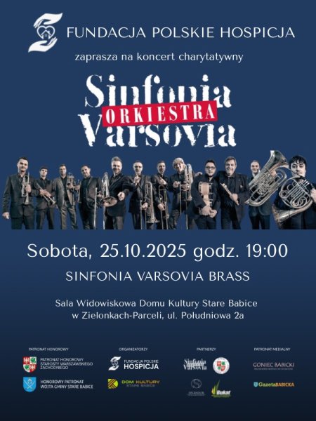 Zapraszamy na koncert charytatywny, którego gwiazdą będzie zespół Sinfonia Varsovia BRASS. Koncert ten stanowi inaugurację działalności społecznej "Fundacji Polskie Hospicja". Sinfonia Varsovia BRASS zagra w dniu 25 października w sali koncertowej Domu Kultury Stare Babice. Zebrane środki finansowe pochodzące ze sprzedaży biletów w całości zostaną przeznaczone na zakup koncentratorów tlenu.