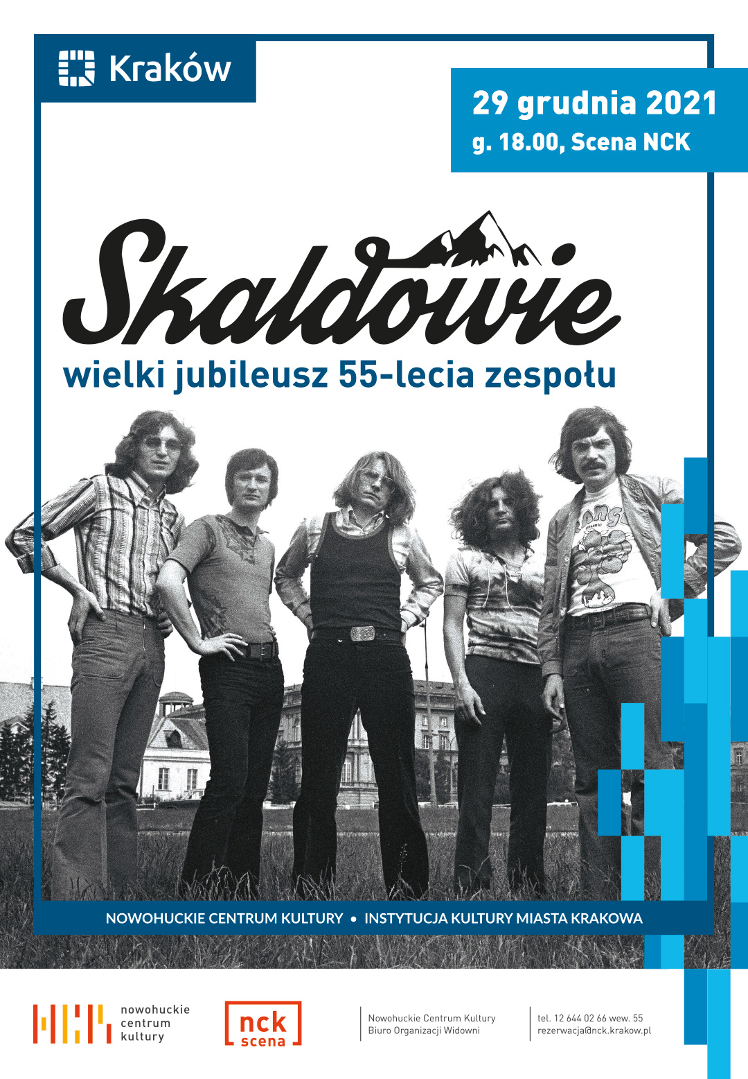 Zespół wokalno-instrumentalny utworzony w maju 1965 r. w Krakowie. Skaldowie w latach 70. byli jednymi z największych gwiazd polskiej sceny, a ich utwory - "Wszystko mi mówi, że mnie ktoś pokochał", "Nie całuj mnie pierwsza", "Medytacje wiejskiego listonosza", "Cała jesteś w skowronkach" czy "Kulig" stawały się ponadczasowymi przebojami. W NCK zagrają z okazji jubileuszu 55-lecia działalności.