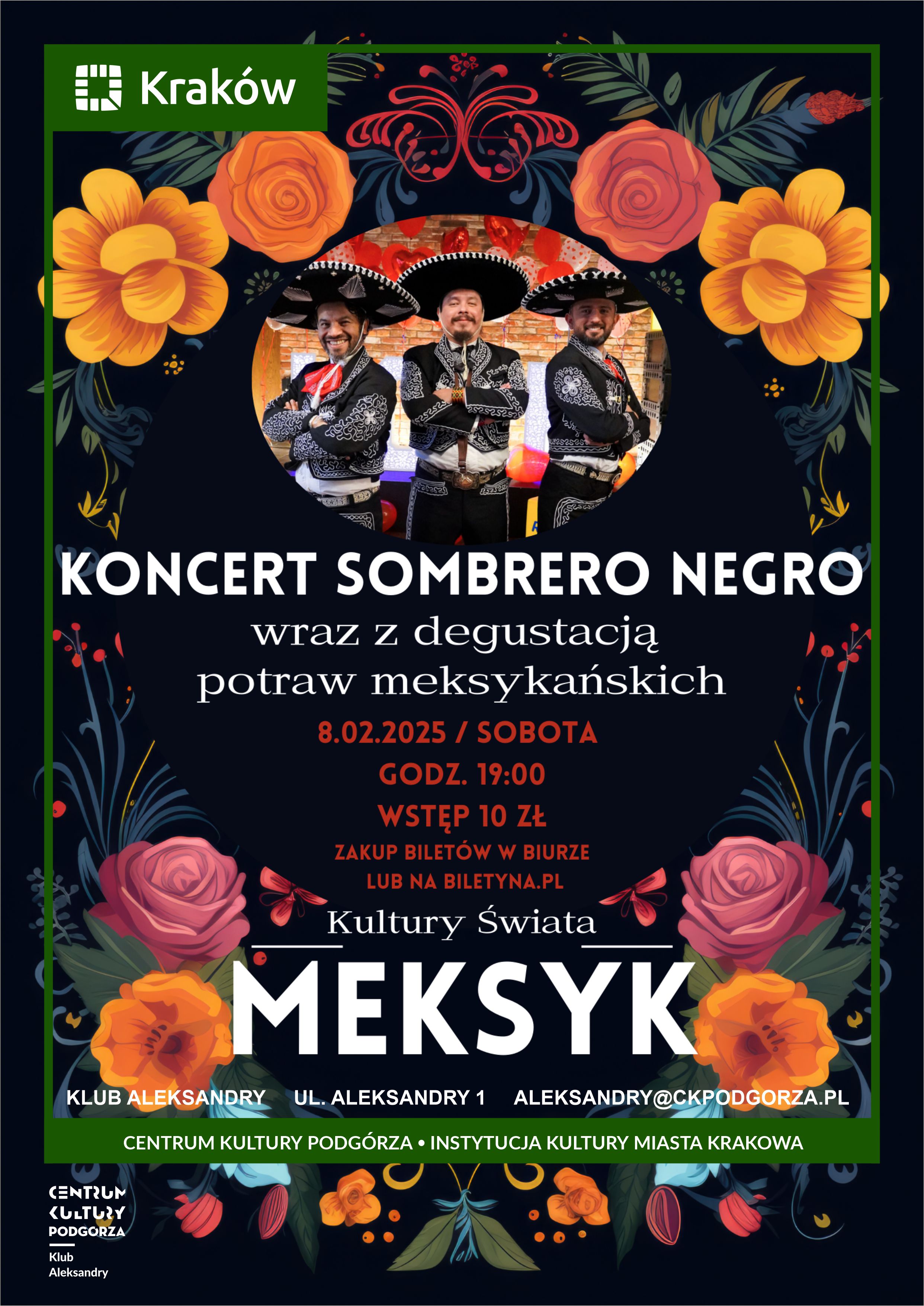 Zespół Sombrero Negro to wyjątkowe trio, które od lat zachwyca publiczność w Polsce i Europie, przenosząc słuchaczy w kolorowy i pełen pasji świat muzyki meksykańskiej. Tworzą go: Eduardo Bortolotti, skrzypek jazzowy oraz ludowy, który ukończył Akademię Muzyczną im. Karola Szymanowskiego w Katowicach. Oprócz klasycznych i jazzowych projektów Eduardo od 15 lat z sukcesem wykonuje tradycyjną muzykę meksykańską. Wspólnie z Alberto Suazo, gitarzysta i multi-instrumentalista, poznali się prawie 20 lat temu w Meksyku, a do Polski przyjechali podczas swojej europejskiej trasy koncertowej. Skład zespołu uzupełnia Eduardo Garcia, gitarzysta i wokalista pochodzący z Boliwii, który od dziewięciu lat mieszka w Polsce i dzieli się swoją pasją do muzyki latynoamerykańskiej, zdobywając uznanie na lokalnej scenie.