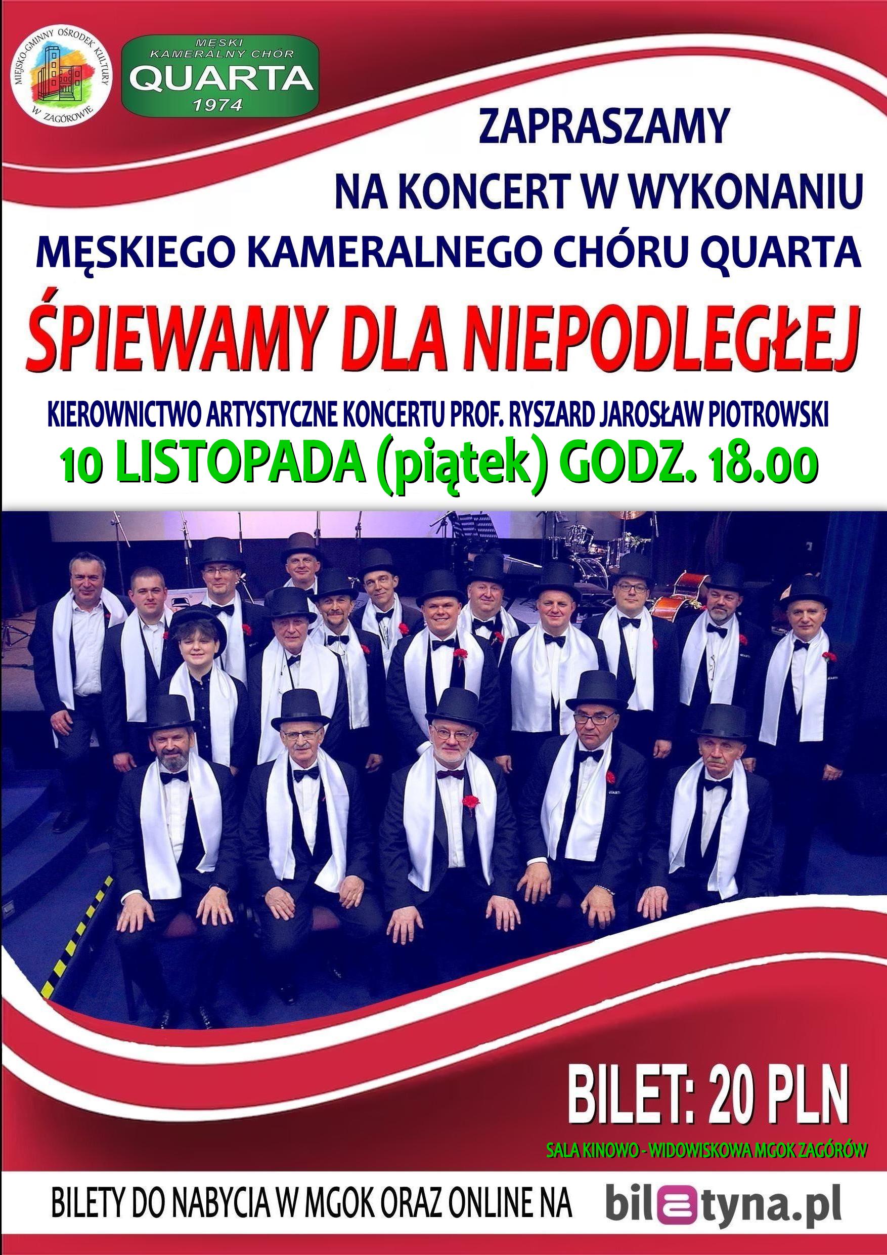 Koncert utworów i pieśni patriotycznych w wykonaniu męskiego kameralnego Chóru Quarta.