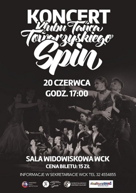 Rok ciężkiej pracy pełnej twórczego zapału, energii i pasji, owocuje dla Klubu Tańca Towarzyskiego SPIN nagrodami na wielu prestiżowych konkursach tanecznych o zasięgu regionalnym, wojewódzkim, ogólnopolskim a także międzynarodowym. Efekty tej pracy można zobaczyć podczas koncertu galowego formacji, na który Wodzisławskiego Centrum Kultury zaprasza już w czerwcu. Premierowe pokazy najnowszych choreografii, przepiękne stroje, wspaniałe umiejętności taneczne oraz porywająca muzyka – to wszystko zawładnie sceną WCK.