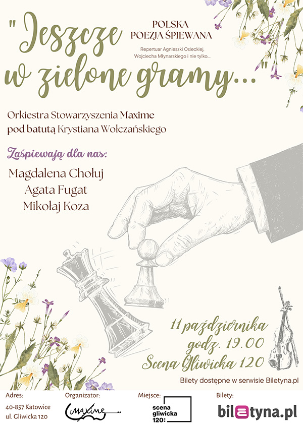 Stowarzyszenie Maxime podbija kolejne śląskie sceny! Już teraz zapraszamy Państwa na nasz koncert poezji śpiewanej i nie tylko, który odbędzie się 11 października w Scenie Gliwickiej 120 w Katowicach. Po raz kolejny będziemy mieli przyjemność zagrać piosenki z repertuaru Agnieszki Osieckiej, Wojciecha Młynarskiego i innych, a wśród nich usłyszymy takie przeboje jak: Niech żyje bal oraz Wariatka tańczy. Bądź z nami tego wieczoru i przeżyj niezapomniany koncert „Jeszcze w zielone gramy…” w wykonaniu Orkiestry Maxime pod batutą Krystiana Wołczańskiego.